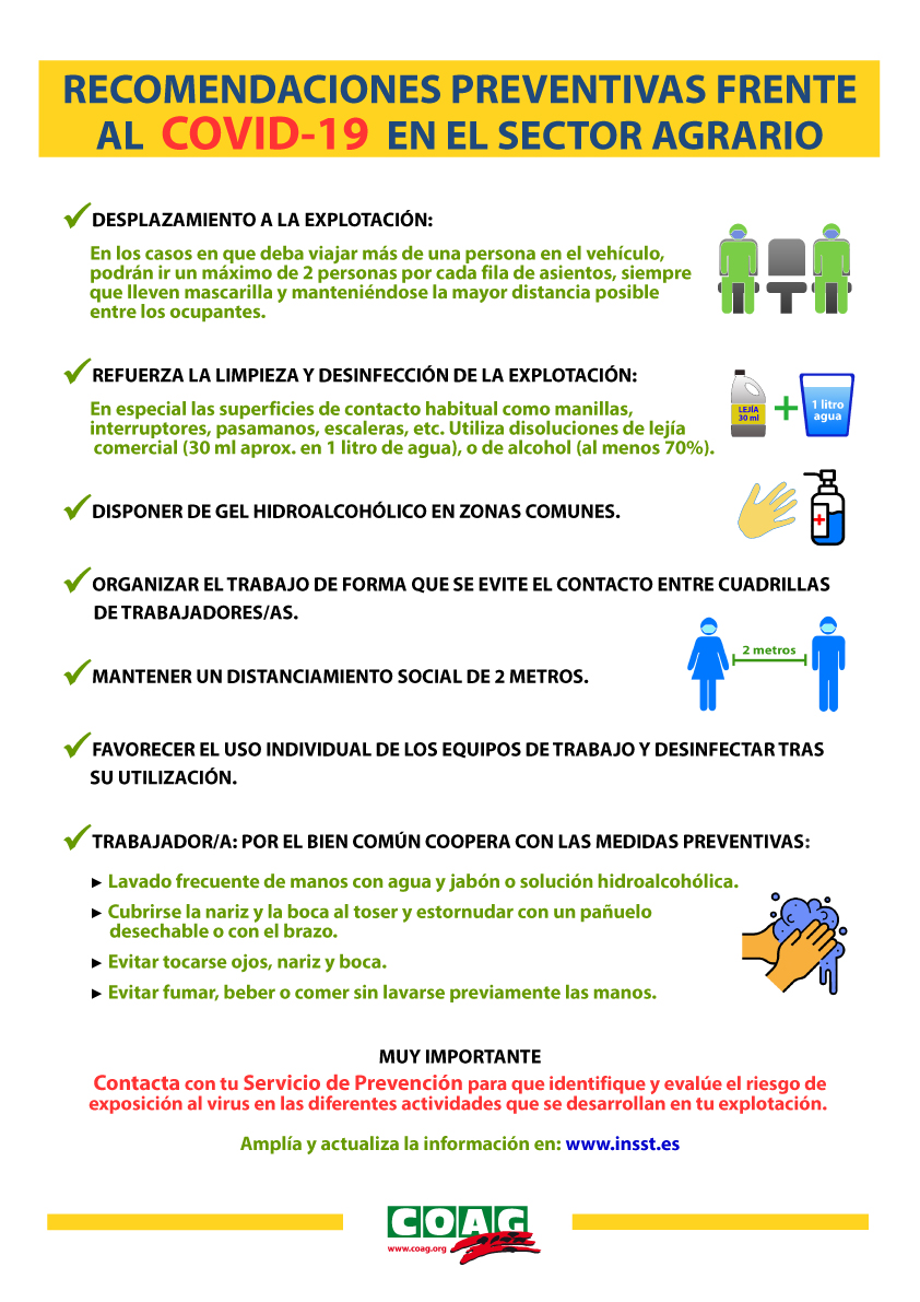 COAG ha publicado un cartel con las principales recomendaciones en materia de prevención de riesgos laborales en el sector agrario frente al COVID-19.